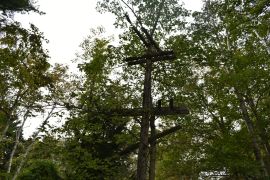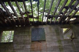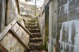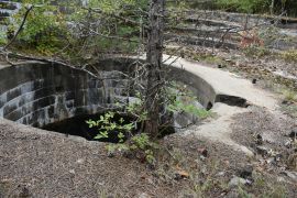 AMTB #2 was constructed in 1942 and built 40ft above sea level. It covered the interior of the main shipping channel. Ammunition and powder were stored in the defunct Battery Daniels and the wooden BC Station was built inside one of the emplacements where it remained until 1987 when it was blown over. Two fixed 90mm guns were mounted on concrete pads and two mobile 37mm guns were located on wooden platforms near the fixed emplacements. This battery was deactivated in 1946 but its guns may have been stored away earlier. The gun blocks are hard to access due to overgrowth and Battery Daniels where the BC station and ammo storage was, is effectively buried in overgrowth.